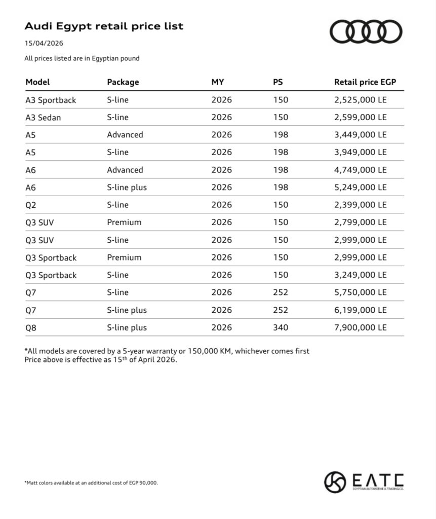 أما عن الفئة السعرية لآودي A6 الجديدة لعام ٢٠٢٦، فجاءت بسعر مميّز يبلغ 4,749,000 جنيه مصري للفئة Advanced و5,249,000 جنيه مصري للفئة S-Line Plus الأعلى تجهيزًا.