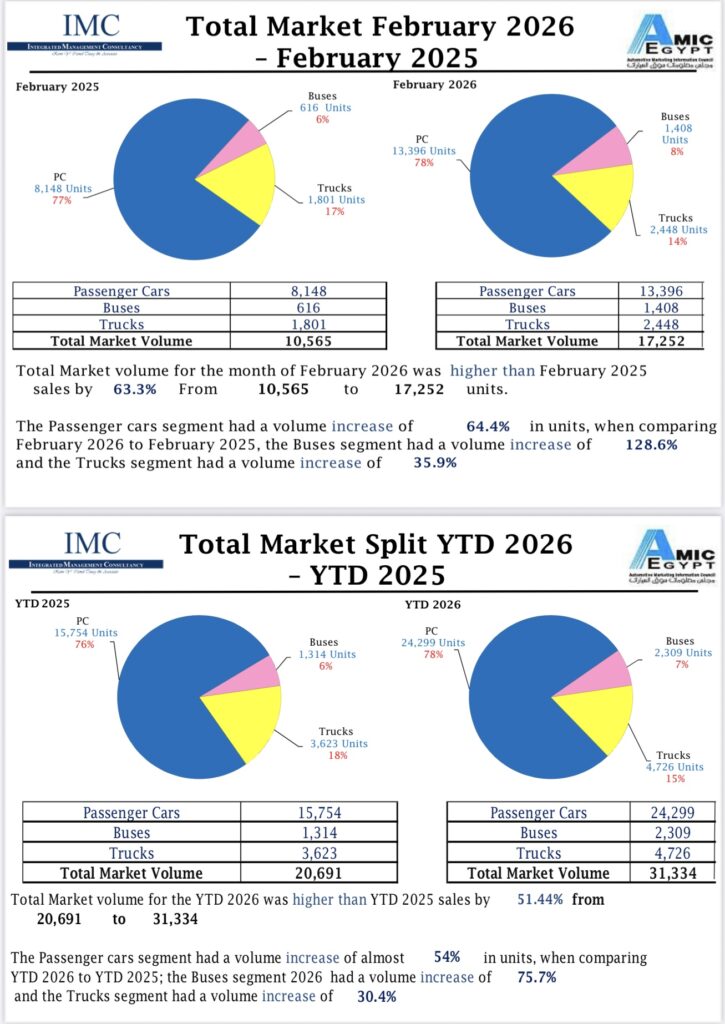 شهدت سوق السيارات المصرية انتعاشة خلال شهر فبراير 2026 على الرغم من التحديات الدولية وأبرزها آثار حرب ايران وتداعياتها على المنطقة ووفق أحدث تقرير صادر عن مجلس معلومات سوق السيارات “أميك”، فإن المبيعات الإجمالية سجلت نموًا ملحوظًا بنسبة 63.3% مقارنة بنفس الشهر من عام 2025.